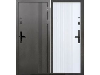 Входная дверь Е-ТАЙГА 9 см ВЕРТИКАЛЬ с электрозамком / E-trade. Особенности двери: минеральная плита, плотностью 70 кг/м. Внешнее покрытие: Атмосферостойкое порошково-полимерное «Антик серебро». Внутреннее покрытие: Меламиновая панель, цвет - эмалит белый. Толщина полотна: 90мм. Толщина короба: 117 мм. Наполнитель двери: Минеральная плита. Контуры уплотнения: 3 контура D-образного уплотнителя EPDM. Тип короба: Открытый. Петли: 3 петли внешние открывание 180*. Основной замок: Умный замок с 5 способами открывания: отпечаток, пароль, телефон, карта, мех. Ключи. Дополнительный замок: Сувальдный (аналог KALE), диаметр ригелей: 16 мм, вылет ригелей: 35 мм. Тип ручки: Сплошная. Ночная задвижка: встроена в основной замок. Эксцентрик: металлический для защелки основного замка. противосъем: противосъемные штыри, 3 шт.